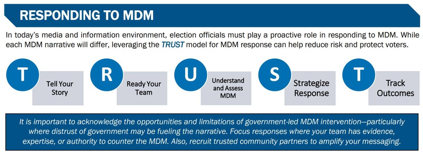 Engaging with clear, consistent, and relevant communications with the appropriate audiences is an effective way to maintain security, build public confidence and get ahead of any MDM threats that may exist. Encourage the use of professional networks and other organizations to amplify this messaging, resulting in a strong network of trusted voices within the sector. You will also want to use this time to look at ways to improve your communication including utilizing new platforms and opportunities to expand your reach.